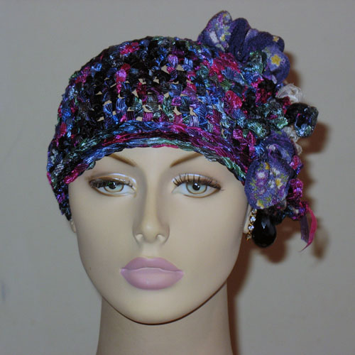 軽いリボンヤーンで編み、サイドには紫色メインの着物生地をクシャッぽく縫い