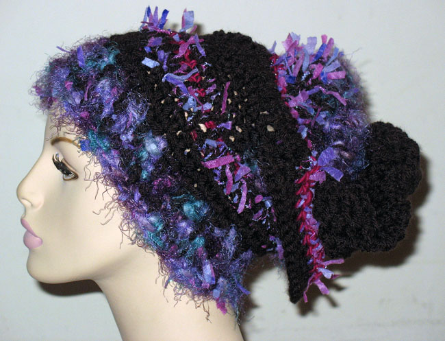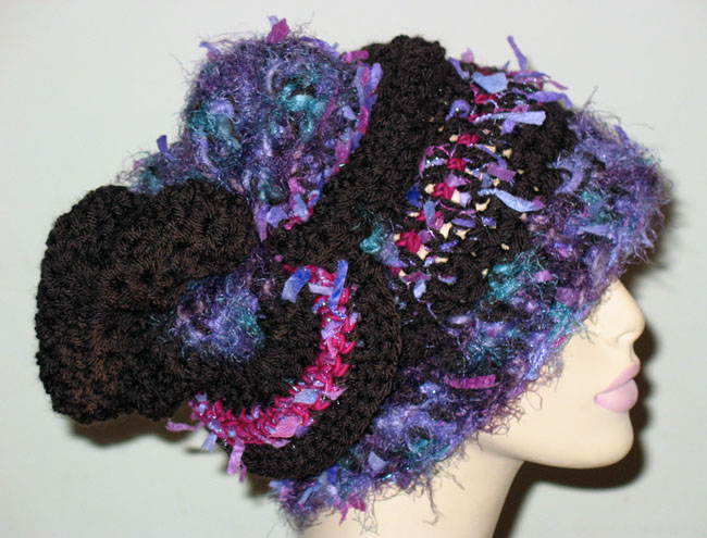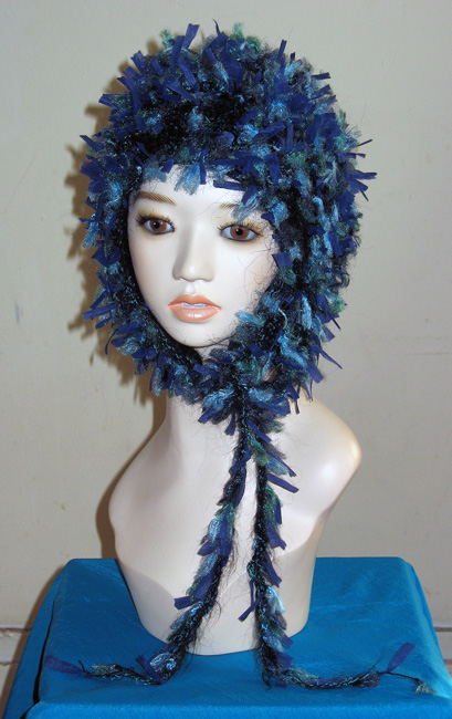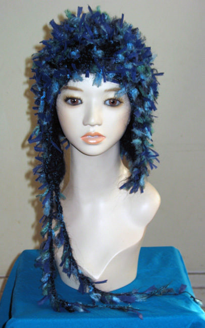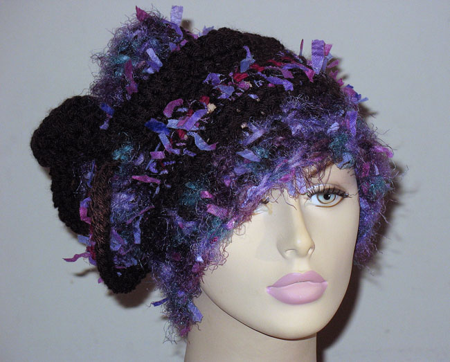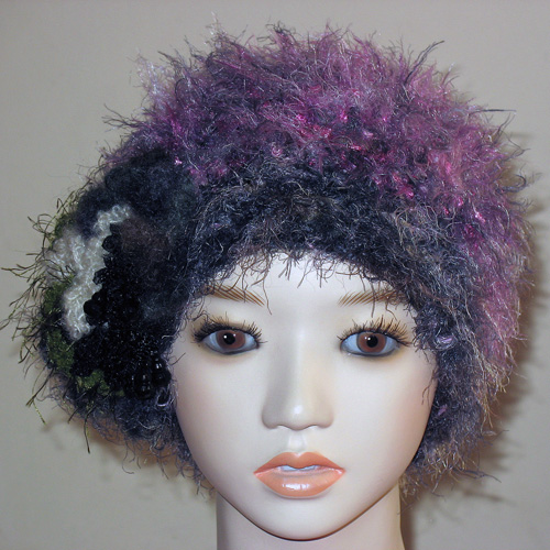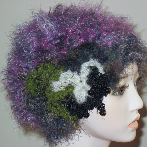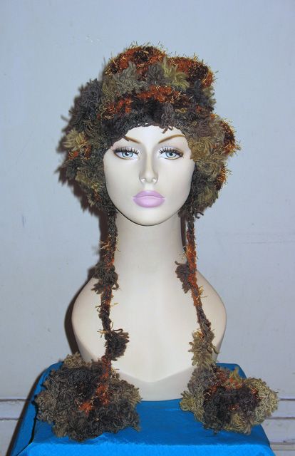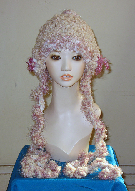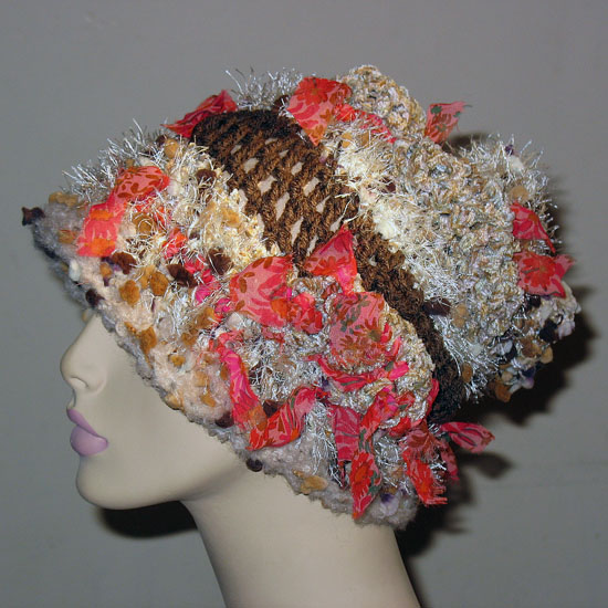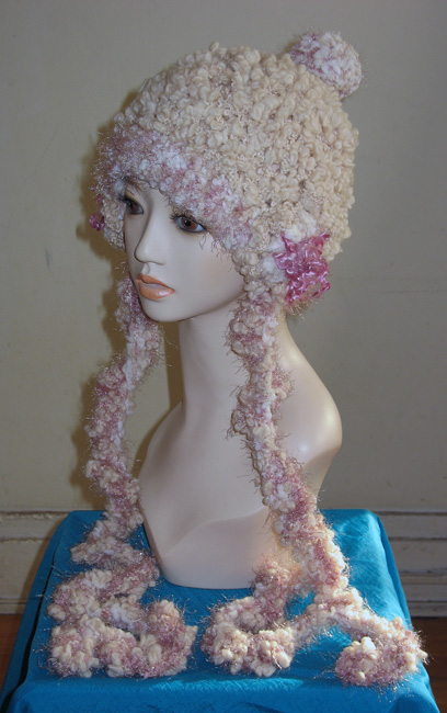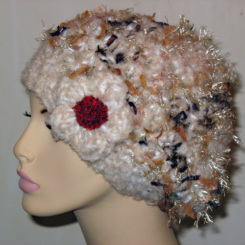 ベージュ系の糸ベースで,布も編み込みデコボコありーの帽子さ