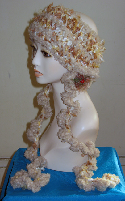 オフホワイトのロウアンのBig Wool Tuftを使って,棒針でそれぞれのパーツを編み,写真のリボンでつなぎ合わせたのだ