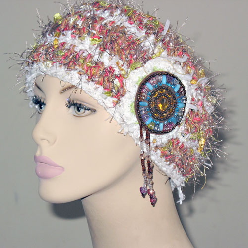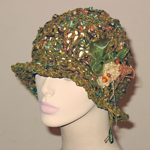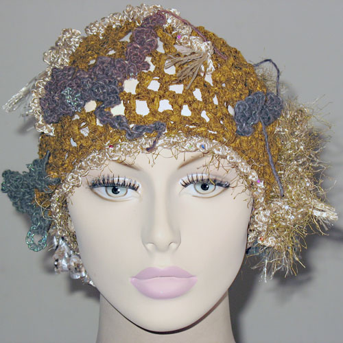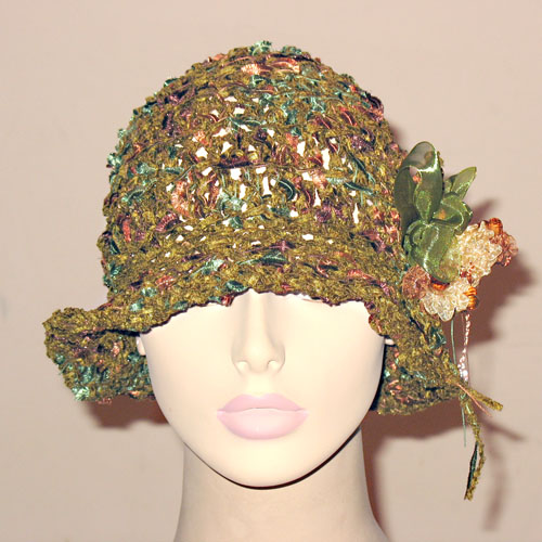 ニッケのカレスとイスタンブールからの渋い色合いながらキラキラが付着していて華やかな変わり糸2本を使い、横にはリボンなどでコサージュを作り縫い付けてますの