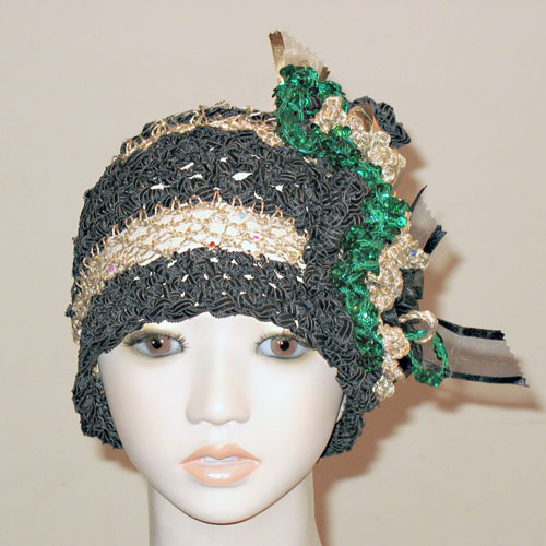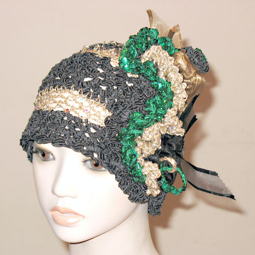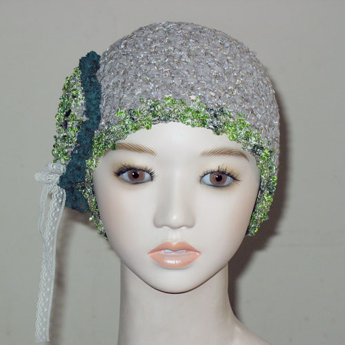 アラシリーズその3は、グレーの糸にサイドにあるお飾りのグリーンはレースのリボンで編んでいます