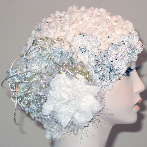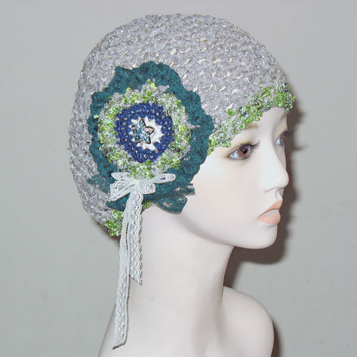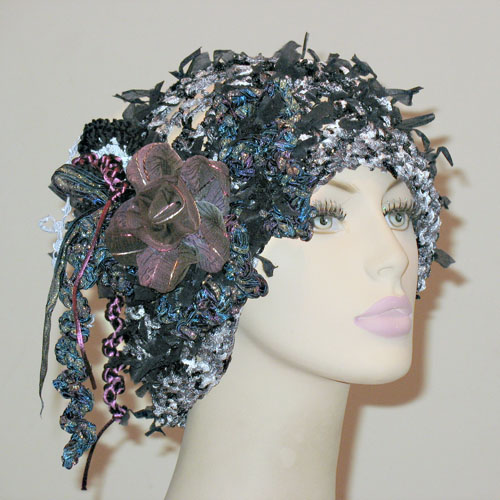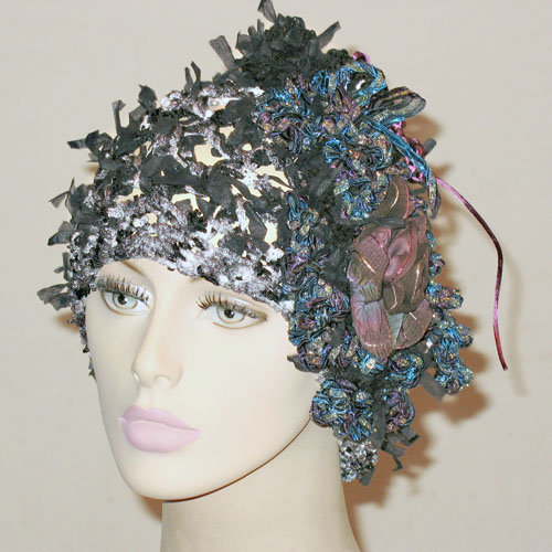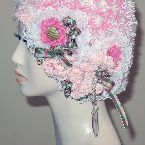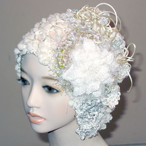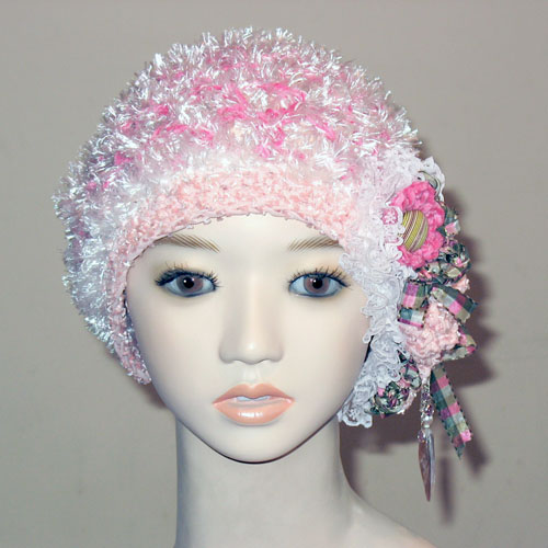 コサージュは取り外せまして,お好きな角度でかぶってもらえる帽子 リボンをコイル状に編み、お下がりがある帽子なのだ