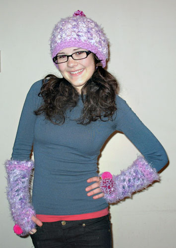 腕巻きは,ざっくり編みで、好きな位置で親指を穴に入れれば、あーむうおーまー的に