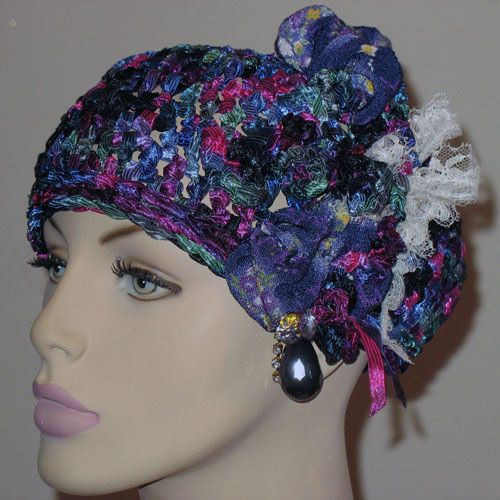 軽いリボンヤーンで編み、サイドには紫色メインの着物生地をクシャッぽく縫い