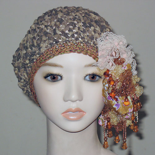 えー、帽子本体はけっこう地味な茶グレーとベージュ系のコットンテープなどを使用